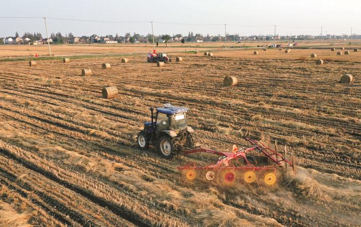 3日,海安市雅周镇庞庄村打捆机在田间打包秸秆。近年来,该市大力推广秸秆回收,将秸秆打包后用于防风固沙、生物质燃料、畜牧养殖、蔬菜种植等领域,有效提高秸秆利用率,在保护生态环境的同时增加农民收入。 姜明摄