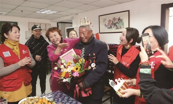 昨天是国际志愿者日。当天,崇川区幸福街道幸福家苑社区、南通阳光公益协会为磨刀老人吴锦泉举办93岁生日会,志愿者们为老人送上生日祝福,并表示将用实际行动传承好志愿者精神。 记者 江建华摄