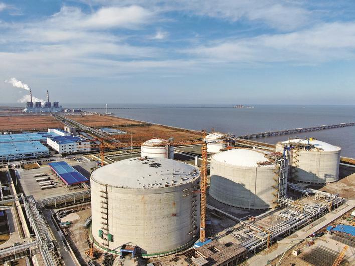 5日拍摄的启东LNG接收站储罐施工现场画面。广汇能源启东LNG接收站新建5#20万立方米LNG储罐项目正加紧推进。该项目包括1座20万立方米LNG储罐及配套设施,计划于2022年建成投产。 记者 许丛军摄