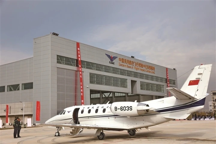28日,中国民用航空飞行校验中心东部基地在南通兴东国际机场正式投入运行。该基地主力运营机型为最新引进的奖状560+型校验飞机,投入运行后,可实现长三角地区1小时航程内机场的快速飞行校验服务响应。 记者 许丛军摄