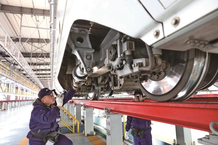 9日,在南通动车运用所存车库,地勤机械师对动车全面细致“体检”。10日零时起,全国铁路实行新列车运行图,南通动车运用所提前谋划,优化生产组织,加强业务培训,不断提高检修质量,确保调图期间车组上线率。 倪雯文 许丛军摄