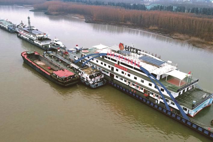 9日,一艘艘船舶停靠在长江如皋段水上绿色综合服务区,正在接受污染物处置。 新春伊始,长江上迎来繁忙运输季节。目前,如皋市水上绿色综合服务区船舶停靠艘次日渐增多,该服务区开足马力,确保每艘船只在20分钟内完成生活垃圾和生活污水的免费处置服务。 吴树建 薛冯摄
