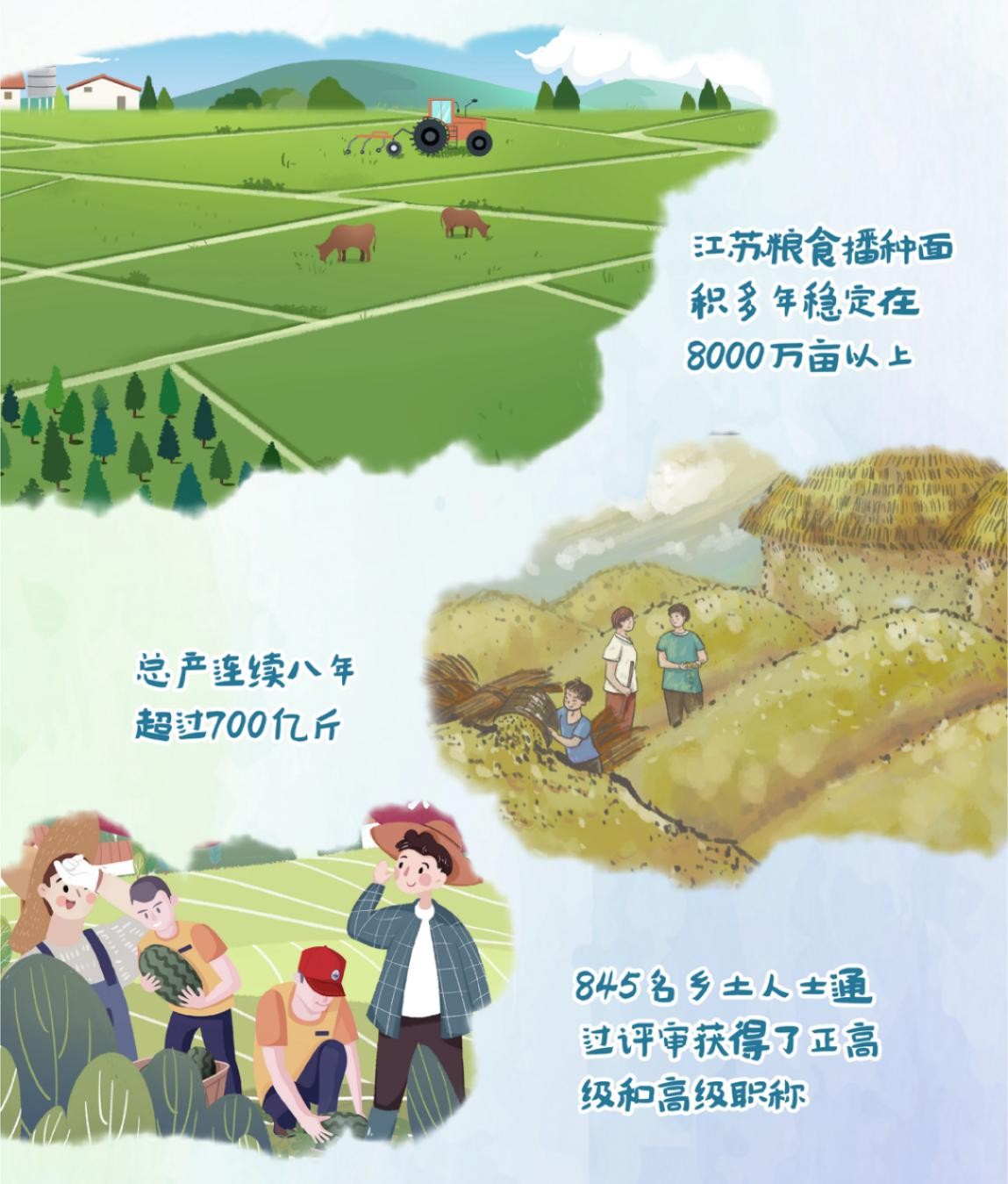 建设新时代鱼米之乡,就要“稳稳的幸福”。数据是最佳的讲述。近年来,江苏粮食播种面积多年稳定在8000万亩以上,总产连续八年超过700亿斤,845名乡土人士通过评审获得了正高级和高级职称......从家底,到生产力,再到人才,不仅证实着江苏农业农村高质高效发展的当下,亦为今后更富成效推进农业农村现代化鼓足了信心。用稳扎稳打的农事,赢得妥妥当当的幸福,鱼米之乡,江苏当之无愧。