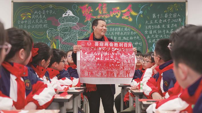 昨日,南通市剪纸非遗传承人顾如铭走进海安实验小学,传承非遗文化,与孩子们一起通过剪纸的方式,喜迎全国“两会”召开。当天,顾如铭还展示了精心制作的“56个民族携手迎盛会”的主题剪纸作品。姜明摄