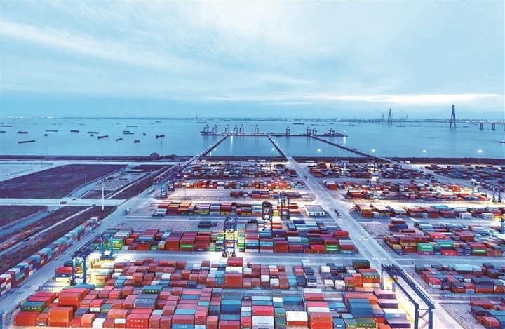 26日晚18时30分在通海港区集装箱堆场、码头拍摄的画面。通海港区是海轮进入长江12.5米深水航道后北岸的第一个港区,也是南通市重点打造的现代化集装箱港区和江海联运枢纽港,自2018年6月投产以来,不断刷新集装箱吞吐量新高。 记者 许丛军摄