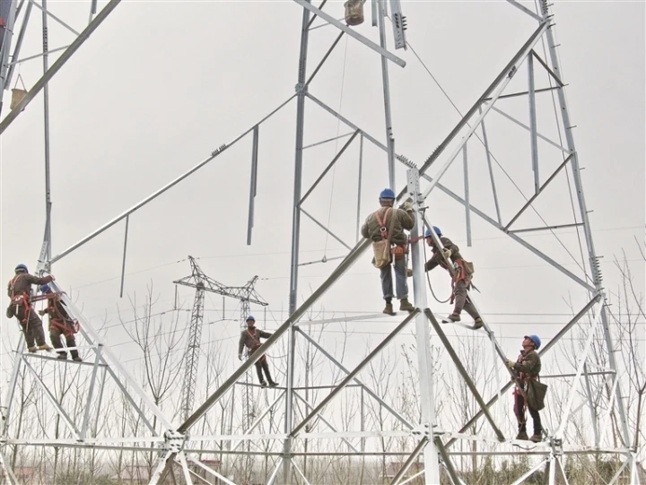 昨天,施工人员在启东北新镇铁塔组立现场进行高空作业。据了解,作为我市迎峰度夏工程的南通六匡~红阳港220千伏线路改造项目,目前80基的基础完成了79基,铁塔组立完成了8基。该工程于2021年11月26日开工,将新建双回杆塔 80基、新建双回220千伏线路25.7公里,六匡变扩建220千伏间隔一个。工程将于6月5日竣工投运。 记者 许丛军摄