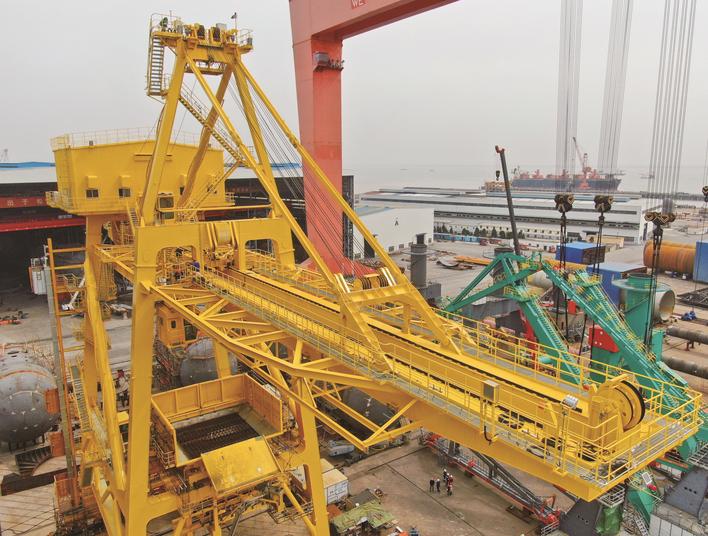 27日在启东海工船舶工业园华滋能源拍摄的出口桥式抓斗卸船机。由江苏华滋能源工程有限公司建造的桥式抓斗卸船机正在加紧调试,将于4月下旬出口印度尼西亚。这台由德国RHC委托生产的1000吨/小时桥式抓斗卸船机宽27米、长70米、高51米,整机重量870吨,适用于1—4万吨的化肥运输船。据悉,这是华滋能源采用全变频技术、在国内安装调试整机出口印尼的首台桥式抓斗卸船机。 记者 许丛军摄