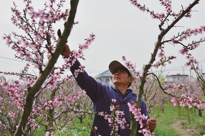 27日,在如皋市如城街道新官村,农民在紫桃园内劳作。随着天气回暖,如皋市各地农民不负春光开展农事活动,田间地头一派农忙的景象。 吴树建摄