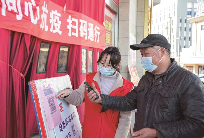 昨日,海安市南莫镇新时代文明实践志愿者在一商超门前指导居民在手机上正确安装南通百通App,扫描“场所二维码”通行。 翟慧勇摄