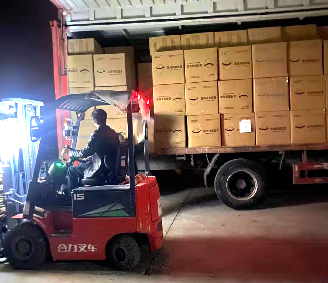 4月10日凌晨,满载医用护目镜、医用隔离面罩、EQ灭菌标签等抗疫物资的集装箱卡车,驶出通州某医疗股份有限公司仓库装卸区,驰援上海。