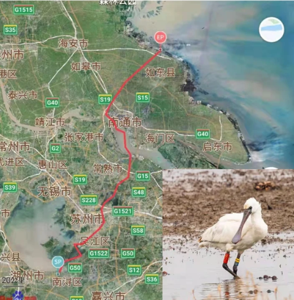 随着天气的回暖,目前正是鸟类春季迁徙的高峰期。在太湖越冬的国家一级重点保护野生动物黑脸琵鹭M06号近日也踏上了北迁的征程。卫星追踪记录显示,4月5日-6日,M06号黑脸琵鹭自东太湖湿地飞抵阳澄湖,之后飞到长江边铁黄沙附近沿江而上,先后经过狼山江畔、江心洲、九圩港江畔等,之后夜间直飞如东丰利沿海湿地。
