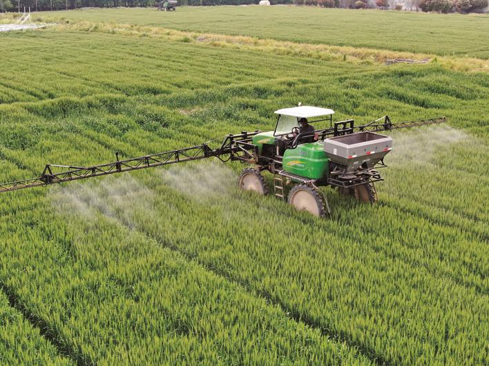 20日,在位于崇川区幸福街道的崇川区现代农业产业集中区里,大型植保拖拉机正伸展巨臂,在绿油油的麦田中进行“一喷三防”药物喷洒作业,对小麦进行病虫害防治,确保小麦增产丰收。