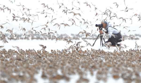 眼下正是候鸟春迁季节,作为鸻鹬鸟类国际迁徙途中的“加油站”,如东沿海滩涂湿地又迎来大量远方的“客人”,它们在这里停歇、补充能量后将继续飞往遥远的北方繁殖地。图为记者昨天在如东东凌滩涂上拍摄到的鸟浪奇观。 记者江建华