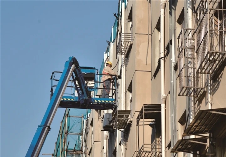 昨日,在如皋市如城街道老旧小区改造项目施工现场,工人在对立面墙施工。