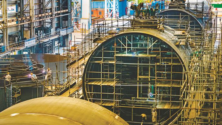 昨天,在南通中集太平洋海洋工程有限公司车间,工人正加紧制造C型液罐设备。 王海兵摄