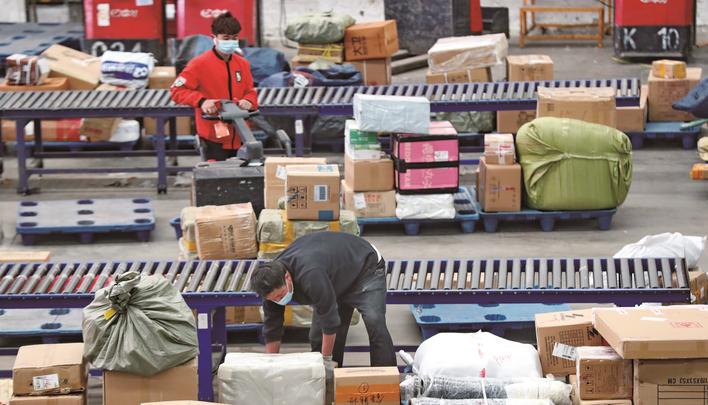 昨天,在南通综合物流示范园,德邦快递工作人员对快递进行分拣、运输。
