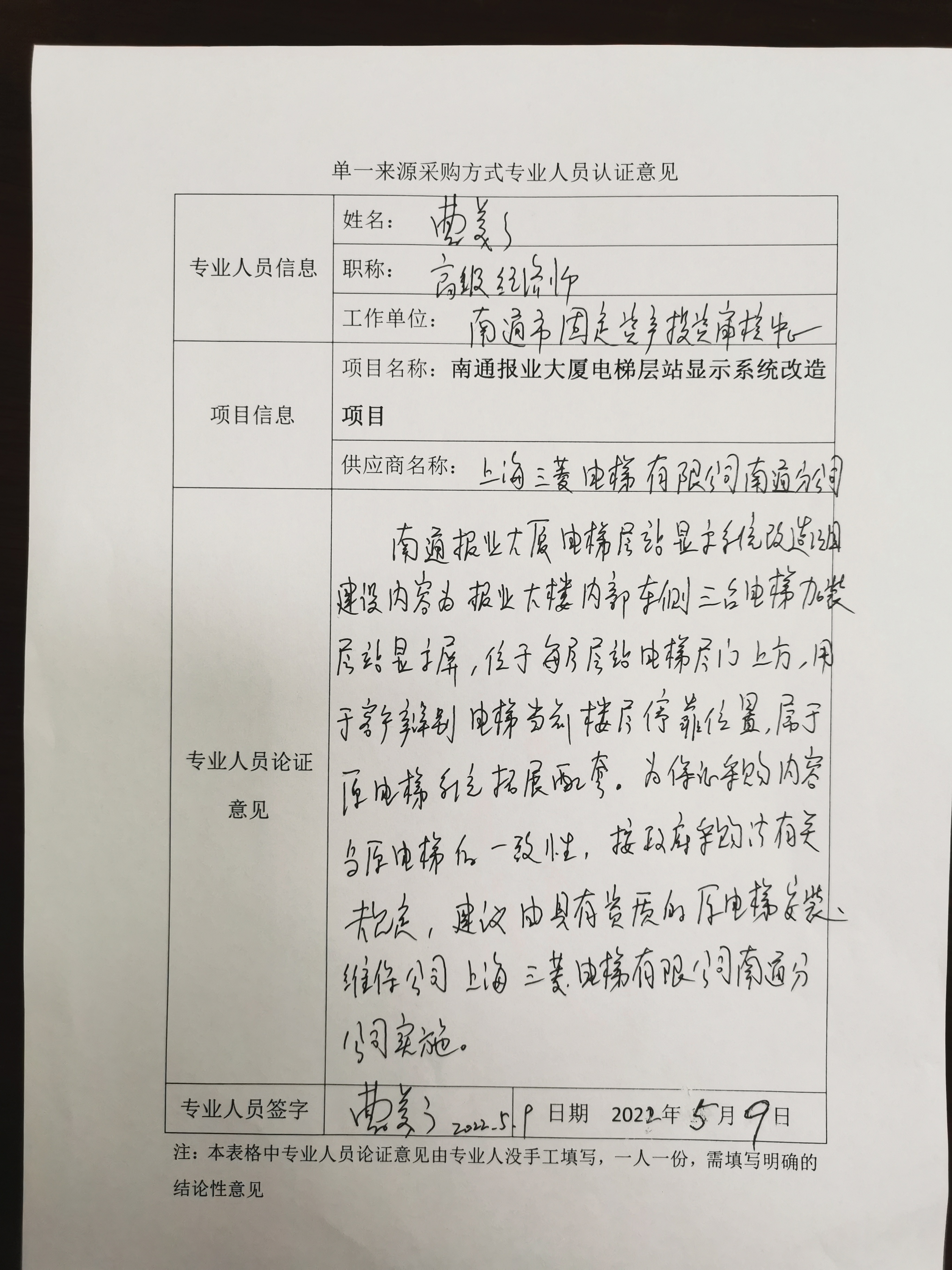 上海三菱电梯有限公司南通分公司为南通日报社直属销售、安装、维保单位,熟悉三菱电梯设备运行原理、产品性能,维修工艺等,为保证经改造后电梯的安全性和正常运行,故本项目采用单一来源采购方式。