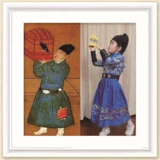 《宪宗调禽图》是中国国家博物馆的馆藏精品。在这次作业中,该校一(3)班学生康宗意身着明朝服饰,模仿画中明宪宗身边的青色仆从。康宗意的妈妈董吉告诉记者,孩子身上的锦衣卫样式服饰是很早以前买的,没想到这次用上了。她说:“孩子选择这幅画主要是他喜欢历史,爱屋及乌吧!”