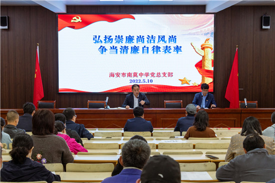 为深入贯彻《关于加强新时代廉洁文化建设的意见》,全面落实十九届中央纪委六次全会和江苏省、南通市纪委二次全会、海安市纪委监委《关于组织开展全市第十五个“5•10”思廉日活动的通知》精神,持续加强廉洁教育,有力强化全校广大党员干部和教职员工廉洁从政、廉洁从教、廉洁自律意识,努力营造学廉、思廉、知廉、践廉的浓厚氛围,积极推进人民满意的廉洁校园建设,5月10日下午,南莫中学党总支部在揽月楼大阶梯教室组织全体党员开展以“弘扬清风正气,建设廉洁校园”为主题的“5.10”思廉日主题党日活动。学校党总支书记、校长崔益根上专题党课,党总支副书记卢少炜主持会议。