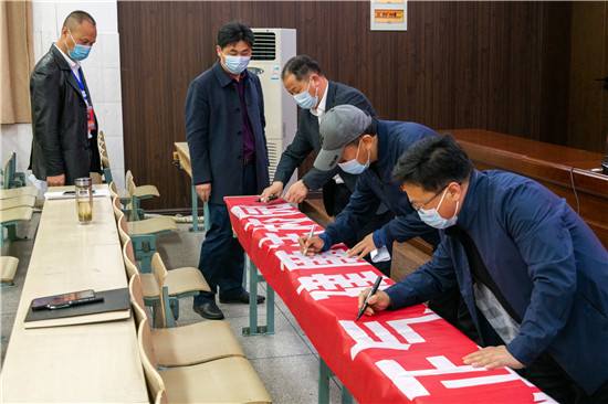 学校班子成员和全体党员教师依次在前排桌面的长条横幅上进行了集体承诺签名。