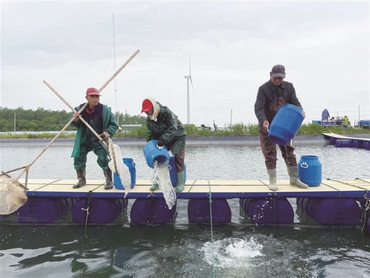 省海洋水产研究所如东基地技术人员将今年繁育的1000万尾大黄鱼幼鱼离送到室外池塘网箱,加快生长速度,等20天左右长到5厘米后,就可以开始增殖放流。