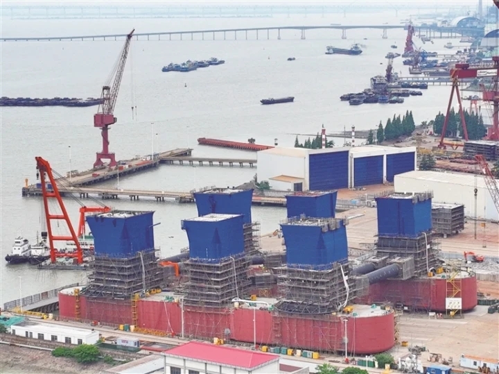 近日在南通吉宝(重工)有限公司航拍的正在建造的半潜式钻井平台。据悉,由南通吉宝(重工)有限公司建造的全球新型深海半潜钻井平台有序推进,该项目计划于2023年底完工。