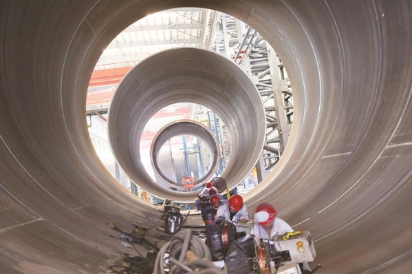 2日在江苏海力风电设备科技股份有限公司拍摄的工人忙碌生产的画面。海力风电是国内领先的风电设备零部件生产企业,今年以来,企业依靠增量扩产、科技创新,降本增效,稳步推进海上风机塔筒、导管架、单桩基础大型化,从5月份开始,现有产能订单已经饱和。 杨新明文 许丛军摄