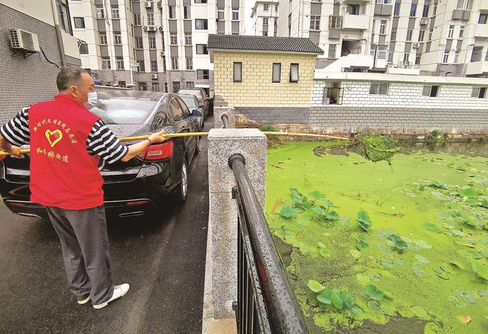 昨天,崇川区和平桥街道濠北社区组织护河志愿者、河道保洁员、“民间河长”打捞居民休闲、散步的好去处新村荷塘里的漂浮垃圾和浮萍,确保荷塘生态环境清秀。李斌