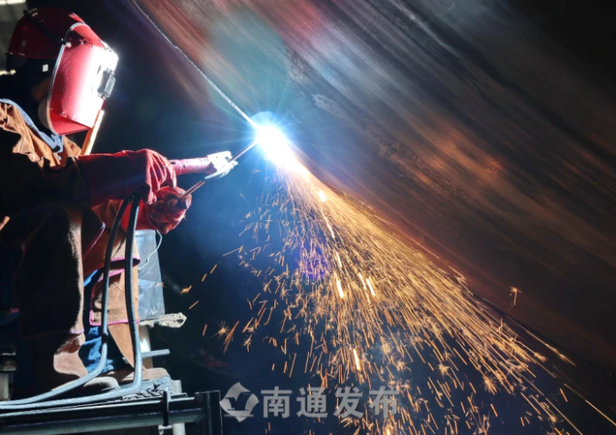歇人不歇机,24小时连轴转,一个个焊工防护服湿了又干,干了又湿,记者在海力海上风电车间看到,焊工秦圣巍的后背上露出白色的盐渍。“我们一个班11个人,多条焊缝同时使用埋弧焊机焊接,由于火焰加热,里面作业环境温度近乎达到人体极限,作业半个小时就出来轮流歇息休息一次,否则,就有可能中暑。”秦圣巍告诉记者,一个班下来要喝掉5瓶盐水、两壶白开水。