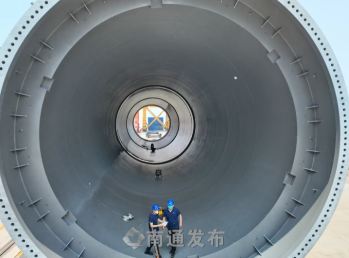 110米长、直径9.5米的海上风机单桩由一块块钢板卷成圆形焊接起来的,焊接一条缝,耗用焊条450公斤,内焊、外焊连续奋战3天3夜。一根海上风电单桩从卸料到发货,生产周期为45天。在48米高空驾驶800吨龙门吊起吊合拢桩基送入油漆处理工场的司机陈钰说:“端午3天不放假,助力‘双碳’作贡献。”