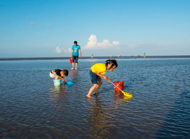 夏季是旅游旺季,黄金海滩景区精心准备了一系列的活动,黄金海滩沿海的万亩沙滩上,栖息着数以亿计的文蛤,极易踩拾。每当潮水退去,光脚踩在沙滩上,扭动腰肢,不一会儿脚板底下那泥乎乎的文蛤,便一只只冒出头来。除了可以免费下海踩文蛤之外,7月1日-7月31日,游客还可以凭门票免费领取文蛤一斤。