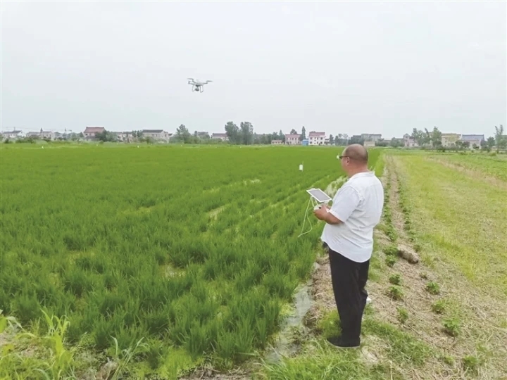 7月23日,如皋白蒲沈腰村,青年双创联盟盟主杨镇华打理的福欣家庭农场田头,南京农业大学“朴侬智慧”科技志愿团团员、博士于明磊正在用无人机巡田。该志愿团共8人,均为农情信息监测诊断、生产系统模拟、精确管理决策等方向硕、博士。