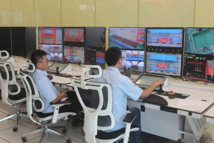 瞄准“世界一流港口”,“2+2”码头按照智能化标准进行建设。记者在远离港区的远程控制室里看到,巨大的集装箱被轻轻抓起又放下,操作工庞浩坐在电脑前,只要轻点鼠标,就能实现对码头装卸作业的操控。南通通吕港口发展有限公司副总经理黄杰自豪地说:我们是江苏省内首家智能化、无人化集装箱码头。