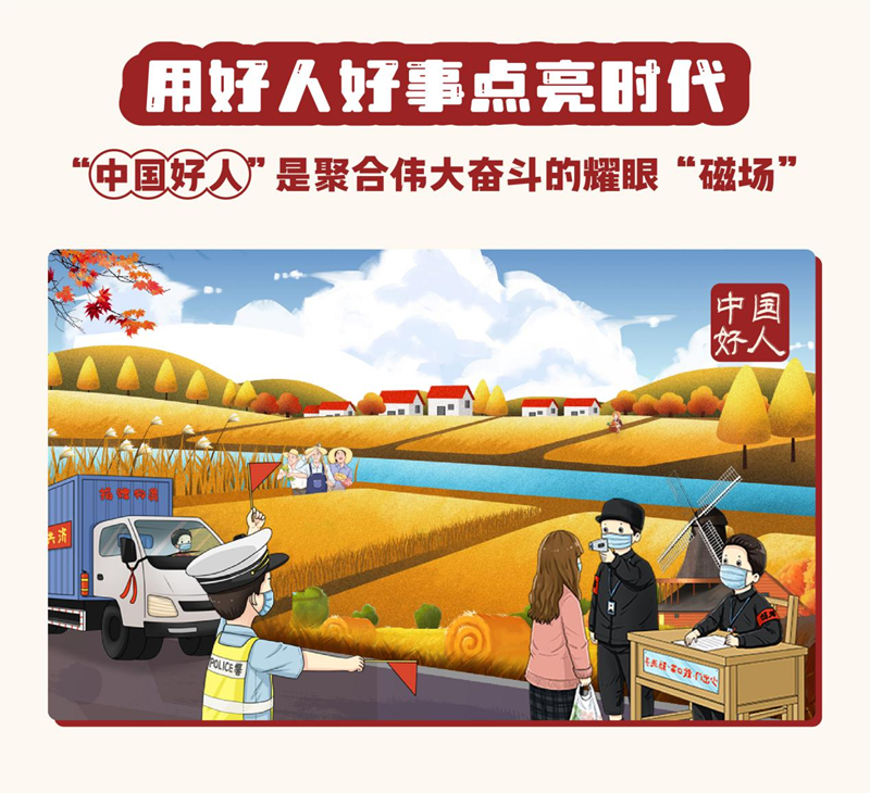 传播是最走心的致敬:“中国好人”功在当代,中国美好利在千秋。用好人好事点亮时代,“中国好人”是聚合伟大奋斗的耀眼“磁场”。一滴水可以照见阳光,榜样足以见证时代精神,从擦亮中华“诚信”招牌的餐饮企业家张全文,到诠释“舍己为人”大爱无疆的保安朱士领,再到解读“赠人玫瑰,手有余香”的村干部孔祥卫......诚如星星之火可以燎原,万千平凡的奉献,讲述了建设美丽中国的帧帧秒秒,记录了“我不负青山,青山定不负我”的点点滴滴。一寸寸“好人”笔触,汇成巨椽绘出伟大复兴路上的“浓墨重彩”。