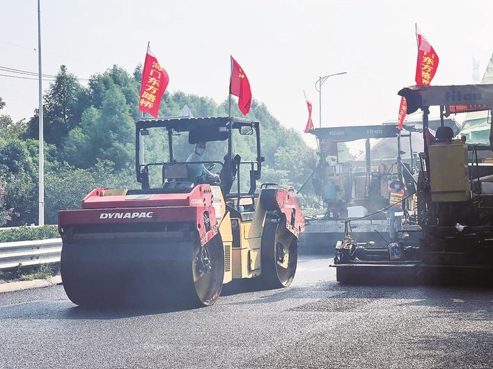 清晨5点,压路机操作手青年党员周华走上压路机发动机器开始准备工作。5点45分,两台摊铺机已就位,运输沥青混合料的卡车在后方排成长龙。路面层摊铺开始,现场机器轰鸣,3台16吨双涡轮压路机、2台摊铺机、15辆沥青料运输车有序排列轮番作业。