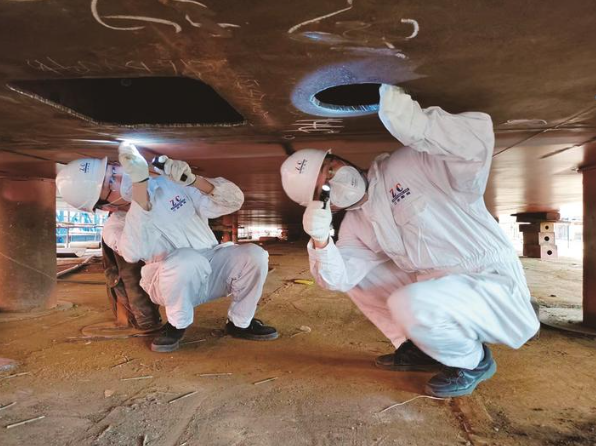 汗水淌得睁不开眼,他们就用衣袖擦一擦继续干,每一个项目、每一个程序,他们都不肯“省略”。陈坚说,这不仅是对船舶负责,也是对自己负责。在完成“通供96”船全部检测检验项目后,他们顾不上休息,随即登上“博丰油供18”船进行检验。此时,已临近中午,整个船体被烈日暴晒了半天,舱内温度已经达到56℃左右。陈坚、钱朴说了一句“既来之,即干之”,仰起脖子又各灌了一通凉水,就义无反顾地钻进了船舱。等到他们走出船舱时,身上厚厚的船检服几乎没有一块是干的,小包里带的几瓶水也早已经成了空瓶。