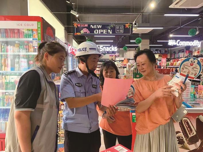 “您好,送您一把反诈小扇子,正面反面都有反诈小漫画、小知识。”18日上午,市公安局崇川分局学田派出所社区民警吴耀忠一手拿着宣传单,一手给辖区店主递上一份清凉。