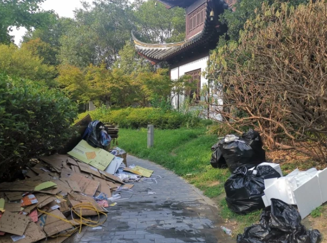 然而,在这处难得的环境中,小游园内却被人放置了不少捆扎在一起的包装纸板、塑料泡沫等各种废品,将原本清幽的环境弄得一片狼藉。记者现场看到,不少过路人见此状也连连摇头。