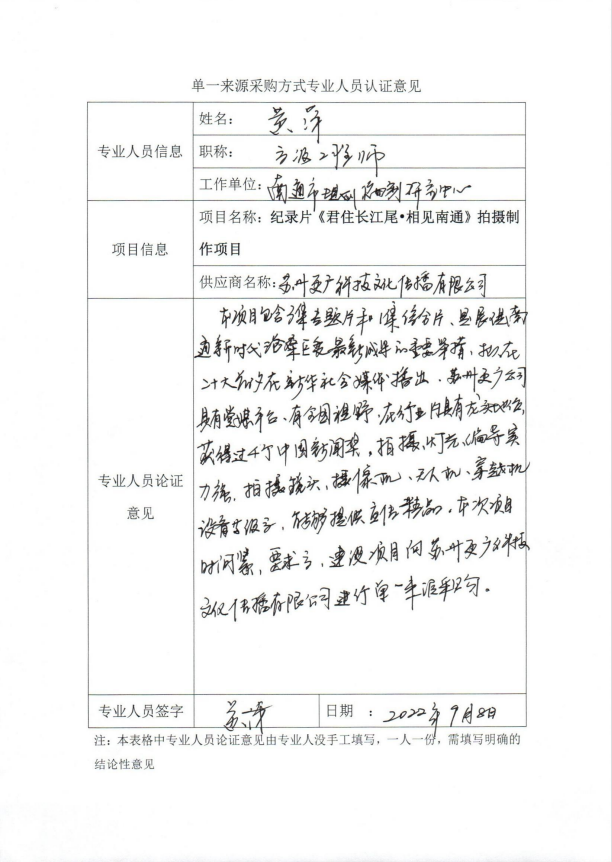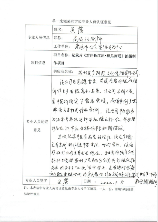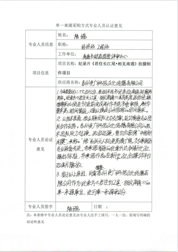 该公司服务方面有党媒背景,在国内省内短视频创作生产有较高知名度;主创人员有新闻从业资质,在行业内有较大影响力,有获得过国家级奖项的履历,专业设备先进;有相关作品案例,并获得过全国性的相关奖;参与服务的纪录片要达到新华社播出标准,并承诺作品在新华社全媒体平台如期播放。本纪录片具有高度政治性,根据要求必须要在9月底之前完成制作并送市委审核,制作要求高,时间非常紧迫,该公司系由国内城市广电标杆的党媒苏州广电总台与全国头部短视频内容服务平台“二更”合资成立,在行业内具有龙头地位,具有绝对实力,能够在最短的时间内拿出最佳作品,高质量地完成纪录片《君住长江尾•相见南通》的拍摄制作任务。论证会上,与会专家听取了采购人代表对该采购项目情况的介绍,对该项目采用单一来源可行性和必要性进行了充分论证,达成随文附件专家意见,综上建议采用单一来源采购方式进行采购。