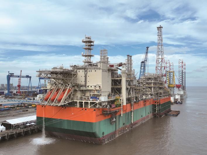 9日在启东中远海运海工拍摄的被誉为巨无霸“海上油气加工厂”的浮式生产储卸油船。当日,启东中远海运海工承建的世界最大天然气处理浮式生产储卸油船N999 Tortue FPSO宣布竣工。 N999 Tortue FPSO是中国船企首次为非洲天然气项目建造的浮式生产储卸油船,船长270米、型宽54米、型深31.5米。投入使用后,气体日处理量将达到5亿标准立方英尺。 记者 许丛军摄