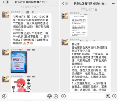 在虹桥街道新东社区善利网格,微网格员郭晓萌每天都会在小区或网格微信群中提醒,“今天做全员核酸”“今天做区域核酸”“老年人要注意防范养老诈骗”“台风来了请大家尽量少外出”等等。自织网以来,推动网格“一站式”服务,增强了从“被动防”到“主动管”的力度与参与度。 虹桥街道新东社区网格支部党员和网格员、微网格员一起与在职党员“敲门入户”固本夯基,实现“红网格、通通建”,点对点互留联系方式,面对面加好友入网格群,实现信息互通及时,上传下达渠道顺畅,资源共享适时有效,织密筑牢网格篱,提升服务水平,让安全深入人心、让爱意无缝传递。善利网格是上世纪八十年代的老小区,电子监控设备少,但安全系数非常高。居民张阿姨说:“我们都很喜欢这种网格氛围,就像老早的四合院,家家户户都熟悉、很亲切!遇到不认识的人都会多问一句,自家院子肯定要看好,我们都喜欢这种妥妥的幸福感!”