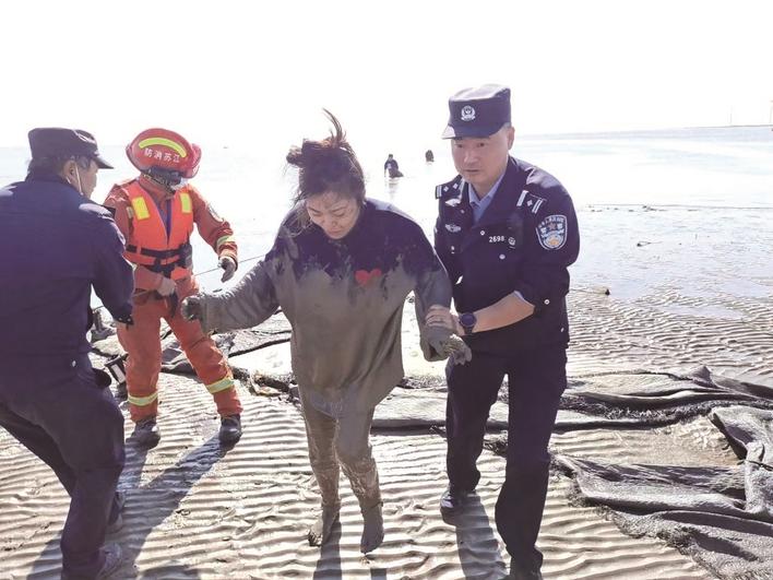 10日上午,在启东市协兴港港口外侧十里海湾有6名游客被困海滩淤泥,启东市公安局连兴港海防派出所接报及时联系救援消防队一起展开救援,遇险群众被救助上岸。