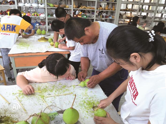 五年来,西亭初中不仅成立了葫芦种植和探究、葫芦工坊、葫芦画坊、葫芦乐坊等多个学生社团,还组织了“葫芦科艺”文本教材的研发,编纂了《葫芦文化》《葫芦种植》《葫芦工艺》《葫芦探究》等教材,探索出一条乡村学校的美育之路。今年1月,顾斌主持的学校课题《创造力视阈下“葫芦科艺”课程实施的行动研究》被确定为江苏省教育科学“十四五”规划立项课题。