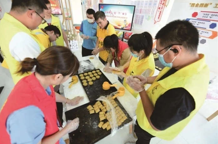 9月9日,留在海安过中秋节的骑手代表和志愿者一起,在服务中心做月饼迎中秋。