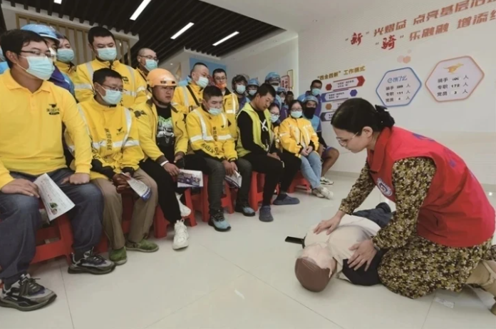 9月23日,海安市外卖送餐员党群服务中心开展“骑手守护,救在身边”知识培训。