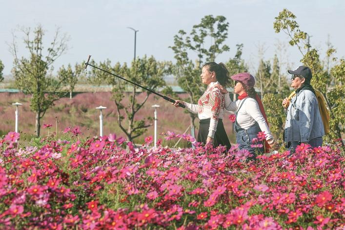 20日,市民在滨江生态花海拍照。当日蓝天白云,秋高气爽,滨江生态花海迎来最佳观赏季,秋英花、向日葵、粉黛乱子草等花卉绿植吸引了市民前来游玩。 记者徐培钦