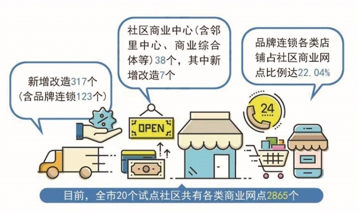 目前,全市20个试点社区共有各类商业网点2865个,其中新增改造317个(含品牌连锁123个);社区商业中心(含邻里中心、商业综合体等)38个,其中新增改造7个;品牌连锁各类店铺占社区商业网点比例达22.04%。