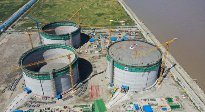 距离中石油江苏LNG接收站仅百米之遥,我省首个自建气源基地——江苏省液化天然气储运调峰工程一期也在有序推进中。“项目分两期规划,一期总投资约52亿元,建设3座20万立方米LNG储罐及配套设施设备;二期总投资约25亿元,新增1座20万立方米LNG储罐和1座8万—26.6万立方米LNG专用码头。”江苏国信液化天然气有限公司总经理陈焰告诉记者,项目计划2024年9月具备全站联合调试条件,2025年上半年投产,全面建成后,总罐容为80万立方米,最大储气能力为4.8亿立方米,单日最大气化外输量可达6000万立方米,可保障全省全行业3天用气量。