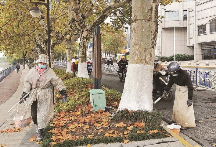 昨日,园林工人正在跃龙路为绿化带行道树进行刷白,帮它们穿上防寒防虫的“冬衣”。李斌摄