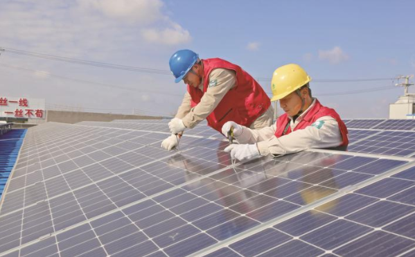 昨天,海安市恒业制丝有限公司内,墩头供电所党员志愿者在维护光伏发电设备。近年来,海安市充分利用厂房、农房以及学校等公共场所屋顶闲置资源,大力发展分布式光伏产业。 周强摄